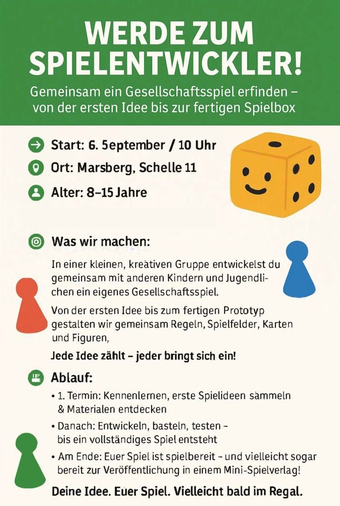 Einmal zum Spieleentwickler werden ist sicherlich schon immer der Traum vieler Kinder und Jugendlichen gewesen. In Marsberg gibt es ab 06. September die Möglichkeit über einen mehrwöchentlichen Workshop genau dies zu verwirklichen. In kleinen und kreativen Gruppen wird hier gemeinsam mit anderen Kindern im Alter von 8 – 15 Jahren ein Gesellschaftsspiel entwickelt werden – von der Idee bis zur fertigen Spielbox. Dabei wird zunächst ein Prototyp erstellt in den wichtige Aspekte wie Regeln, Spielfelder, Karten und Figuren einfließen werden. Entwickelt wird getreu dem Motto: „Jede Idee zählt – jeder bringt sich ein!“.